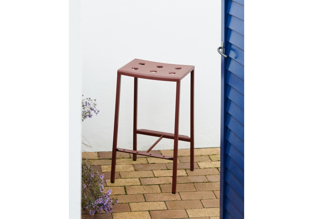 Balcony diseñado por Ronan & Erwan Bourrollec para Hay es un taburete bar para exteriores realizado en acero pintado en polvo con revestimiento de dos componentes; una imprimación exterior y una capa de polvo que proporciona una barrera a los elementos corrosivos, haciéndolo adecuado para uso en exteriores. Disponible en diferentes acabados y dimensiones. A petición es posible añadir un cojín de asiento.