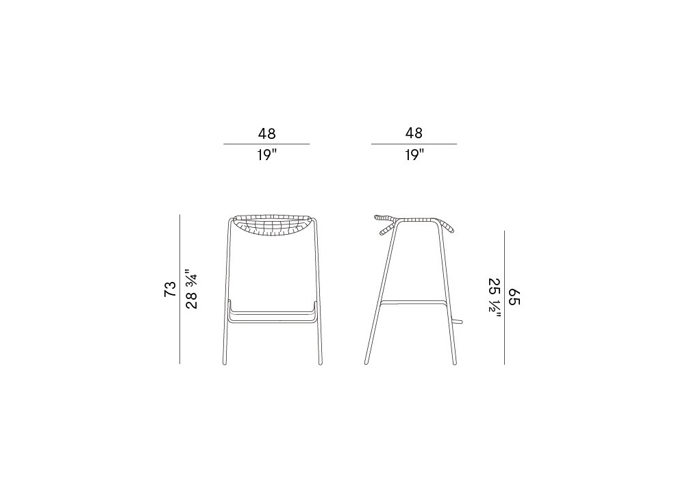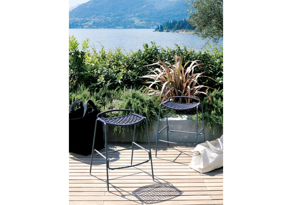 Egao diseñado por Toan Nguyen para Potocco es un taburete para exteriores con patas en tubo de acero inoxidable pintado y trenzado en cuerda o cuerda sintética moka.