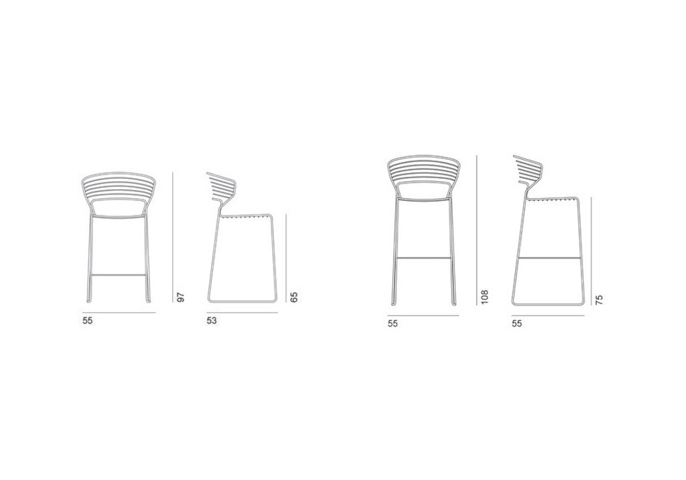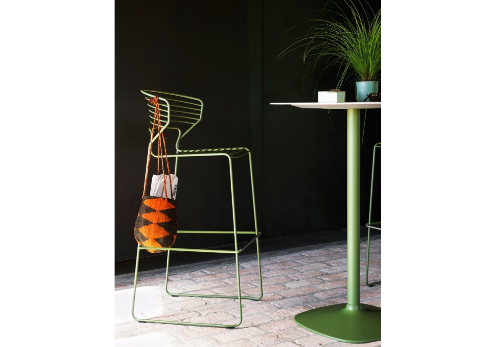 Koki Wire 754 Outdoor diseñado por Pocci e Dondoli para Desalto es un taburete apilable con estructura de varilla de acero. El reposapiés está protegido por un perfil de acero inoxidable. Disponible en diferentes acabados y dos alturas.