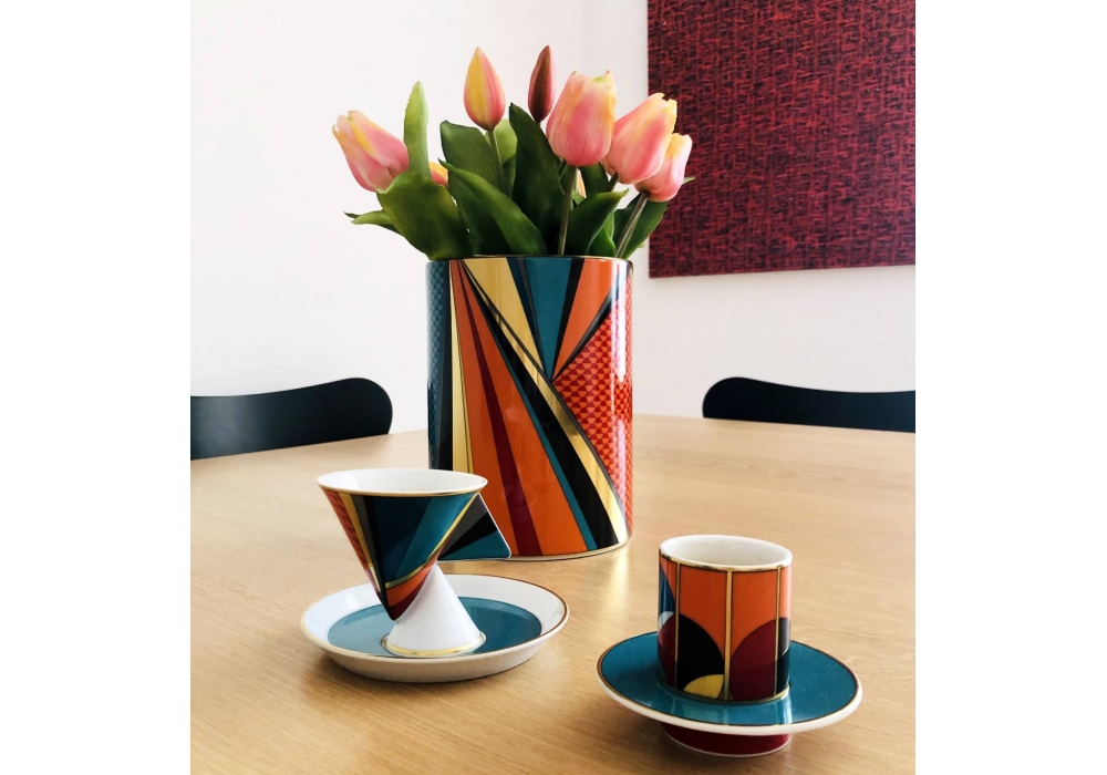 Futurismo diseñada por Vista Alegre es una taza de café con platillo realizada en porcelana. Los elementos están pintados a mano enriquecidos con detalles dorados. La colección Futurismo es una reinterpretación contemporánea del movimiento pionero de todos los movimientos modernos, celebrando el progreso y marcando un período de reinvención de los lenguajes artísticos.