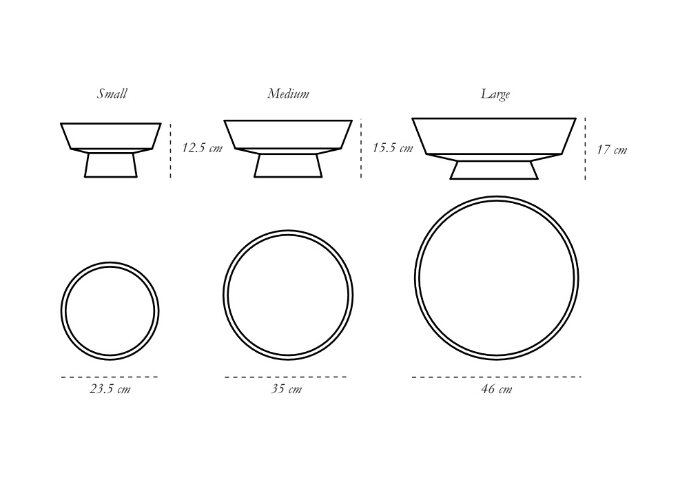 | Dimensiones | Ø 46 x H 17 cm. Ø 35 x H 15.5 cm; Ø 23.5 x H 12.5 cm. |