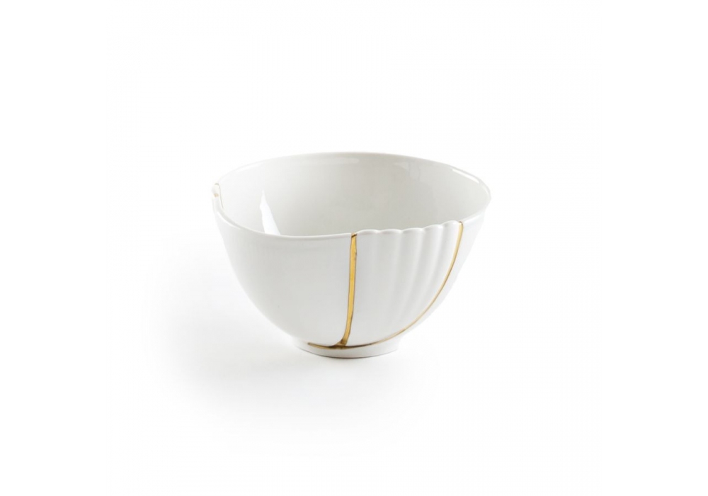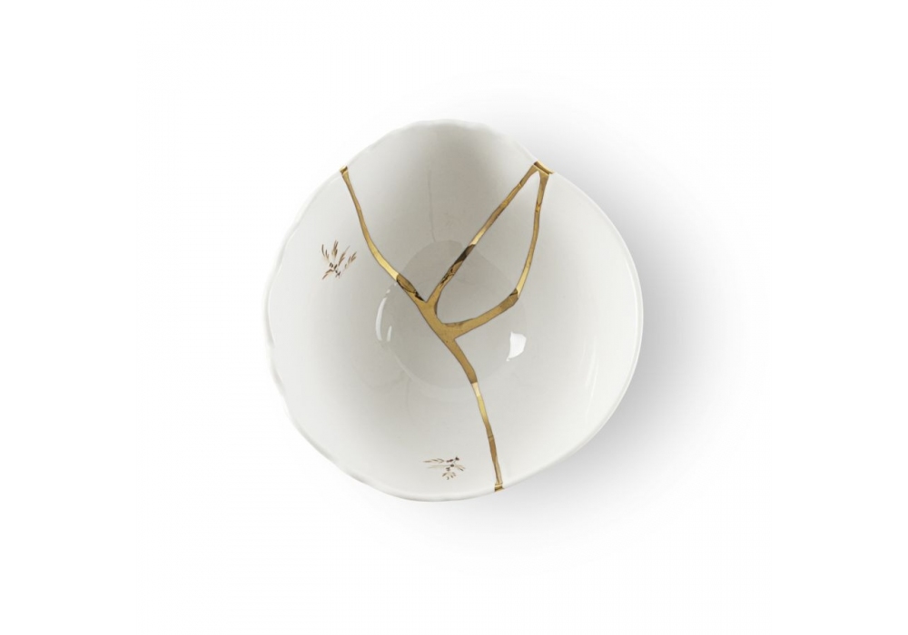 Kintsugi diseñado por Marcantonio para Seletti es un cuenco de porcelana blanca y dorada creado combinando dos formas opuestas. La superficie está decorada con diversas figuras florales y pigmentos.