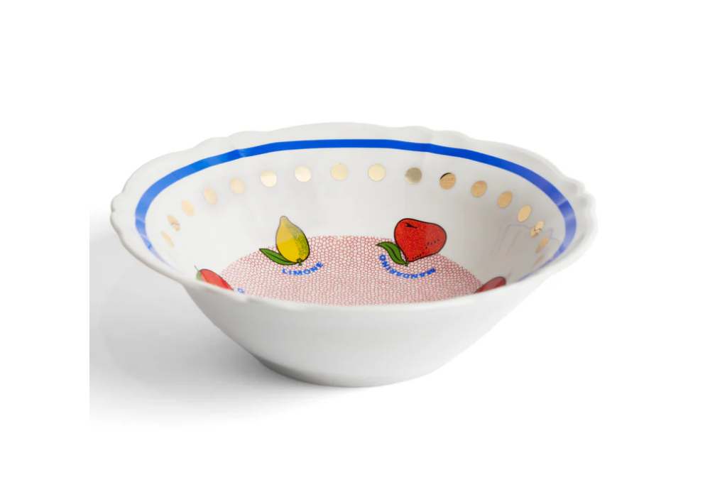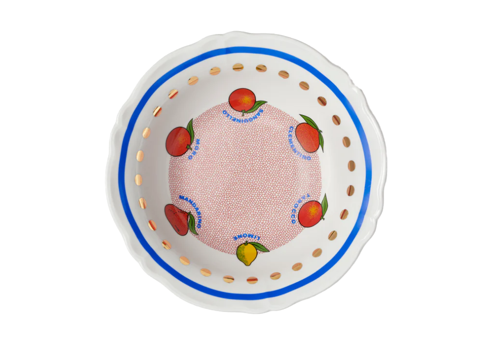 Agrumi firmado por design Sam Baron para Bitossi Home es una ensaladera de porcelana con calcomanía y detalles dorados. Apto para lavavajillas y un máximo de 250 lavados. No apto para microondas.