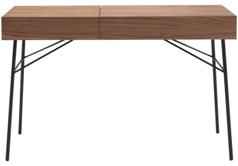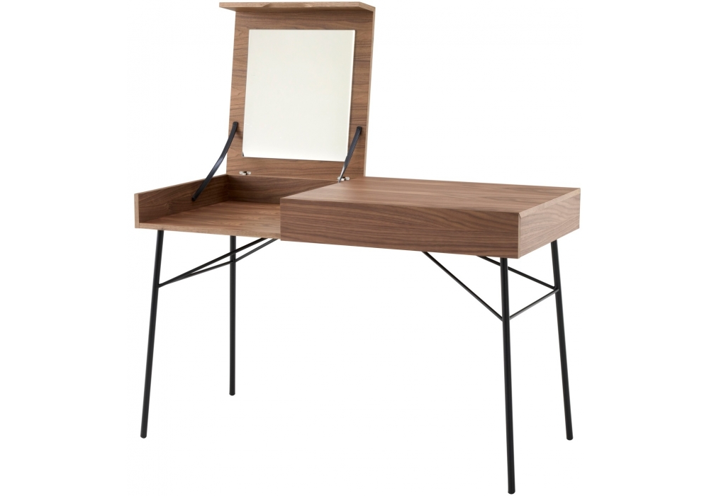 Feminine furniture par excellence, the Juliette dressing table, designed by Evangelos Vasileiou for Ligne Roset, is particularly graceful. The dressing table space offers a large work surface. This is complemented by a drawer and a second storage space closed by a lift-up cover. This cover has a large mirror on its internal face, which can be used when the cover is in open position. The whole piece is made from panels of MDF finished in blond American walnut veneer, which brings a touch of both richness and warmth. This dressing table may also be used as an apartment desk. Black lacquered steel base. Internal dimensions (in cm) of storage space: H 8.8 W 48 D 51.5. Internal dimensions of drawer: H 5 W 63 D 41.5.