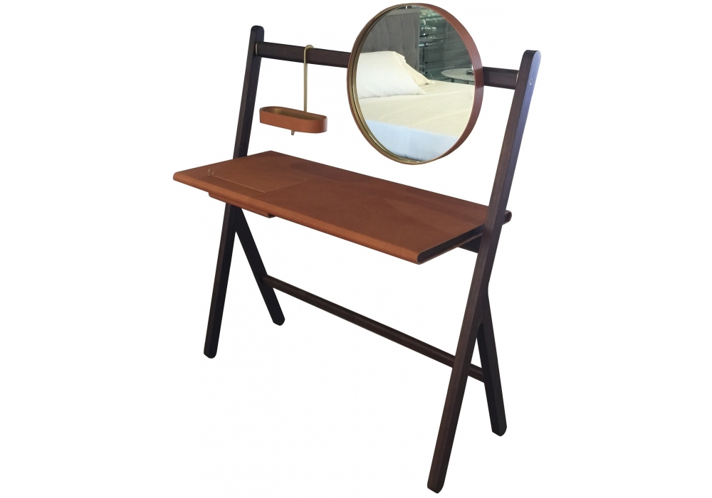 Ren designed by Neri & Hu for Poltrona Frau is a dressing table. It features a round mirror, an oval key tray and a top with a lift-up compartment in Saddle Extra leather with a round-shaped brass handle. The internal part of the compartment is covered with a saddle-leather mat. The Ren complementary furnishing collection is the result of studies of the home entryway by Neri & Hu. Guests are welcomed in this space and it offers them the first glimpses of the personal furnishing style.