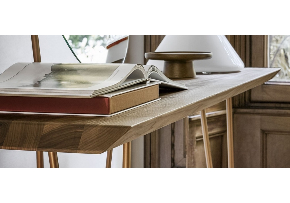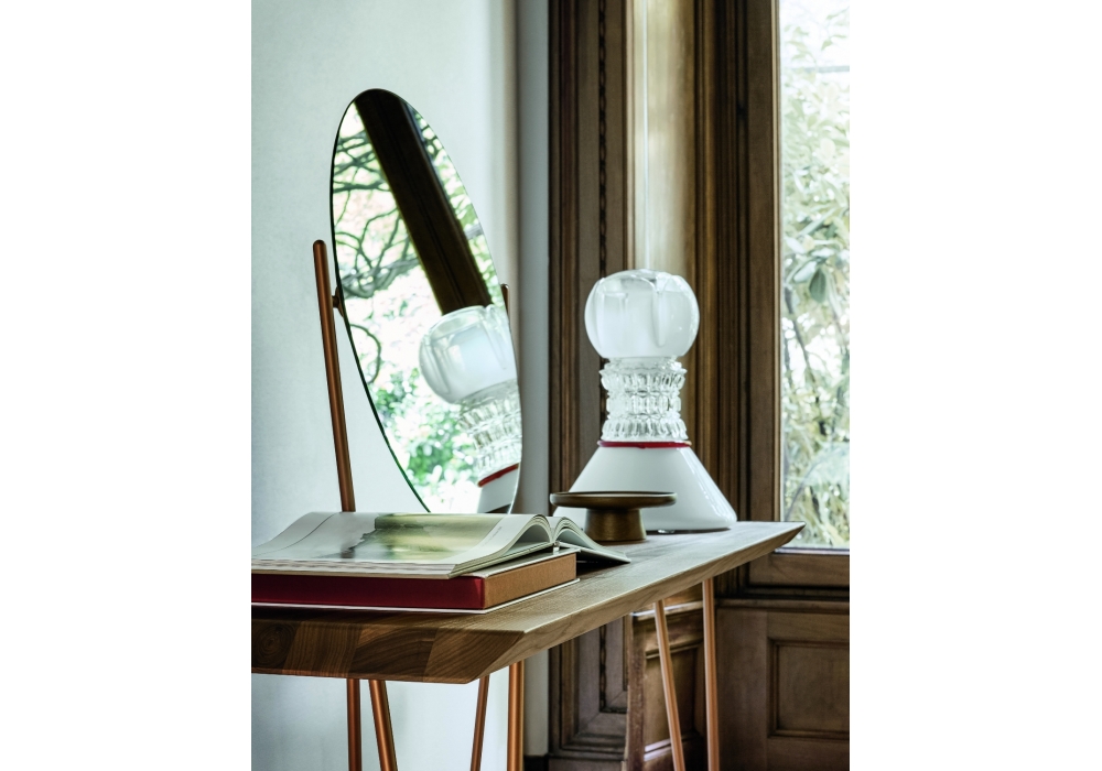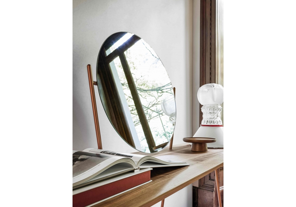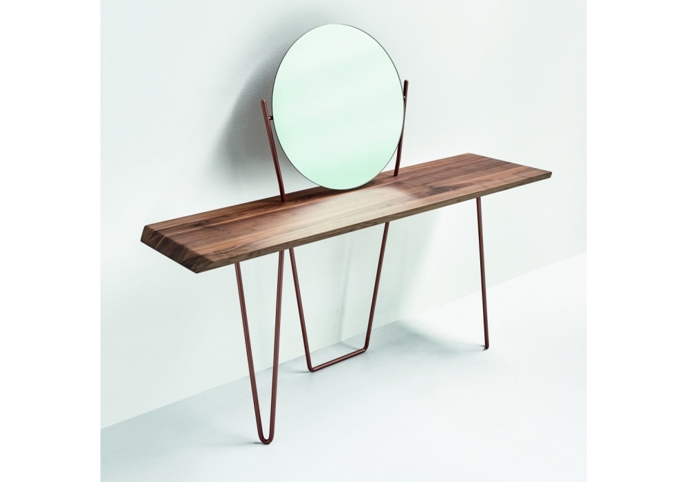 Coseno diseñado por Mauro Lipparini para Bonaldo es un tocador/consola con espejo ajustable. El tablero es en madera contrachapada con base disponible en diferentes acabados.