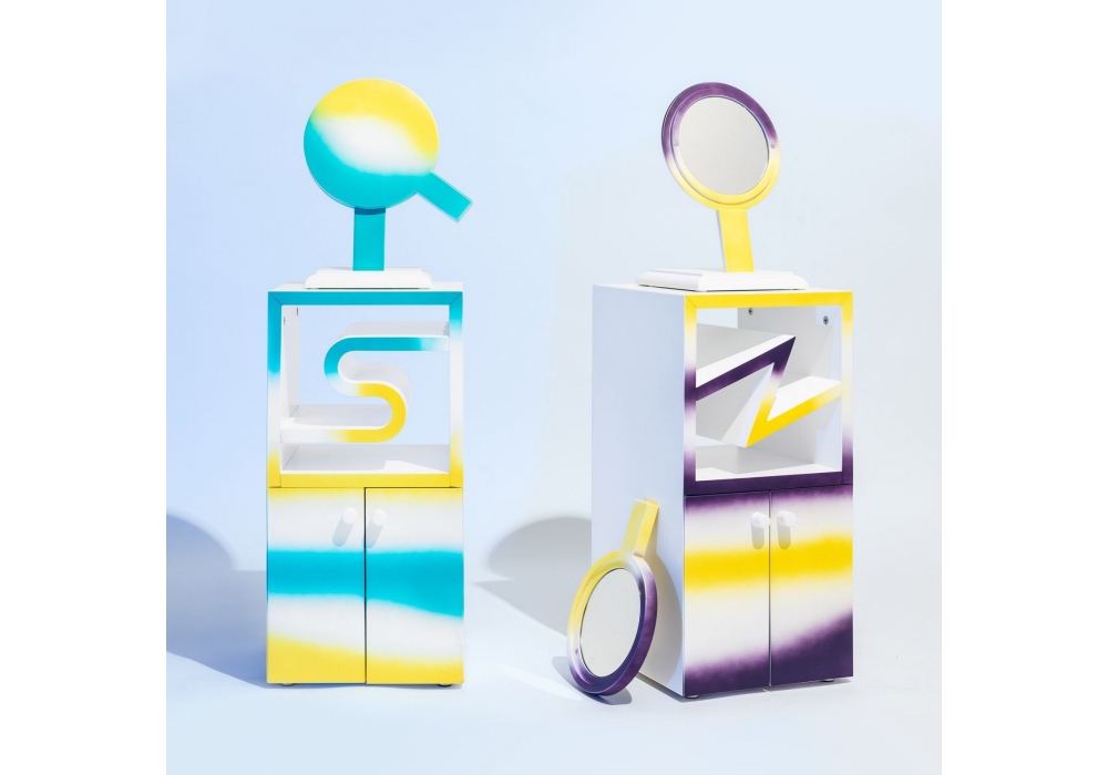 Fuji diseñado por Michael Graves para Memphis Milano es un tocador en madera lacada y serigrafiada equipado con un espejo fijo y móvil.