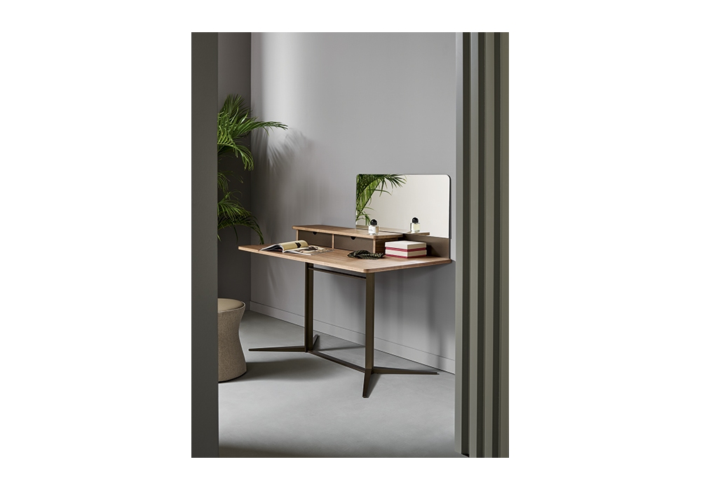 Nelson Vanity diseñado por Matteo Nunziati para Bonaldo es un tocador con tablero en madera chapada en nogal, cajones en madera lacada bronce mate, base en metal color bronce.