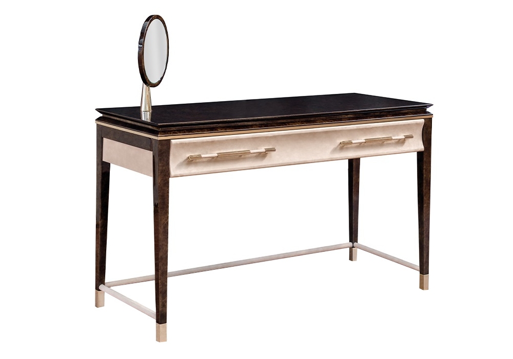 Noir diseñado por Andrea Bonini para Turri es un tocador con estructura en MDF y paneles de aglomerado en acabado lacado brillo, revestimiento en piel y tapa en mármol o madera. Hay un cajón con revestimiento interior en microfibra. Pies y partes metálicas en diferentes acabados. Disponible en la versión con o sin espejo.
