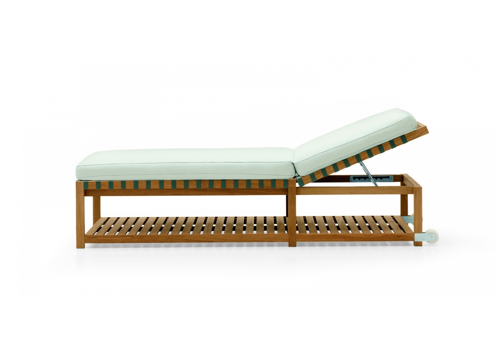 Network is an outdoor sunlounger deisgned by Rodolfo Dordoni for Roda. Sunlounger with wheels and teak bar for towels, in the teak structure and belts in different colours. Network is Roda’s archetypal collection, the one which marked the firm’s real turning point in terms of design.
