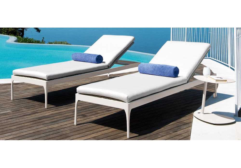 Infinity producida y firmada por Ethimo es una tumbona de exterior con estructura en aluminio y fibra lightwick o ethitex en diferentes acabados.
