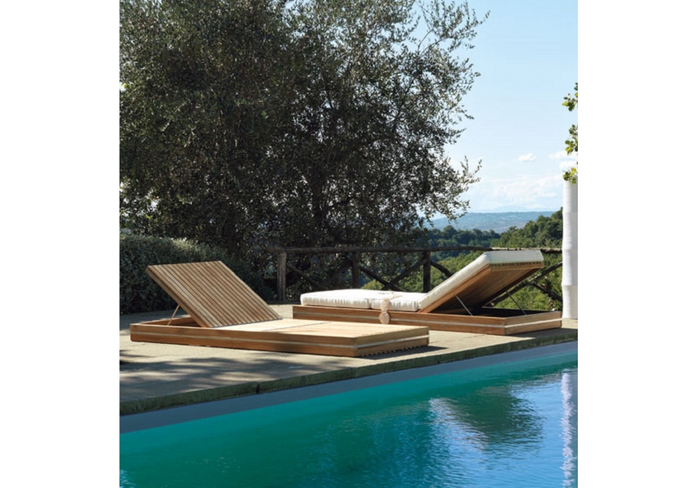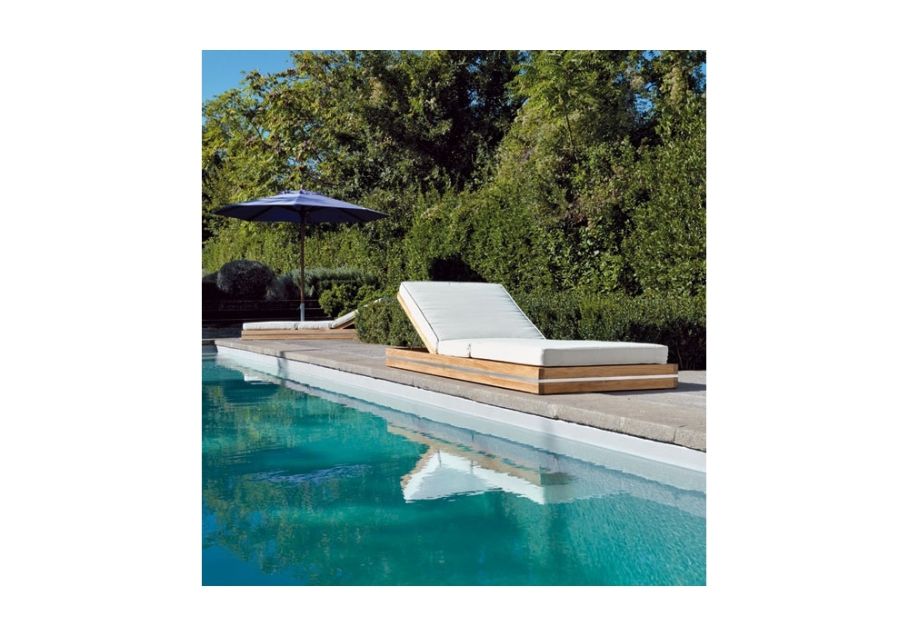 Essenza diseñada por Ethimo es una tumbona realizada en teca con insertos de acero y respaldo regulable en cuatro posiciones. Colchón adicional en tejido acrílico, disponible en diferentes acabados.
