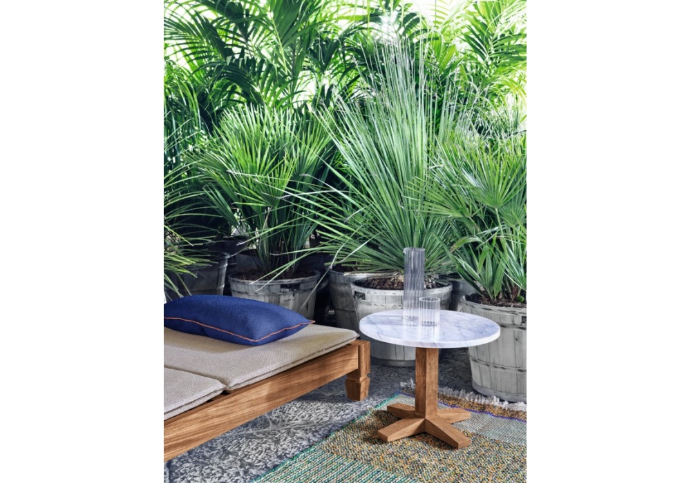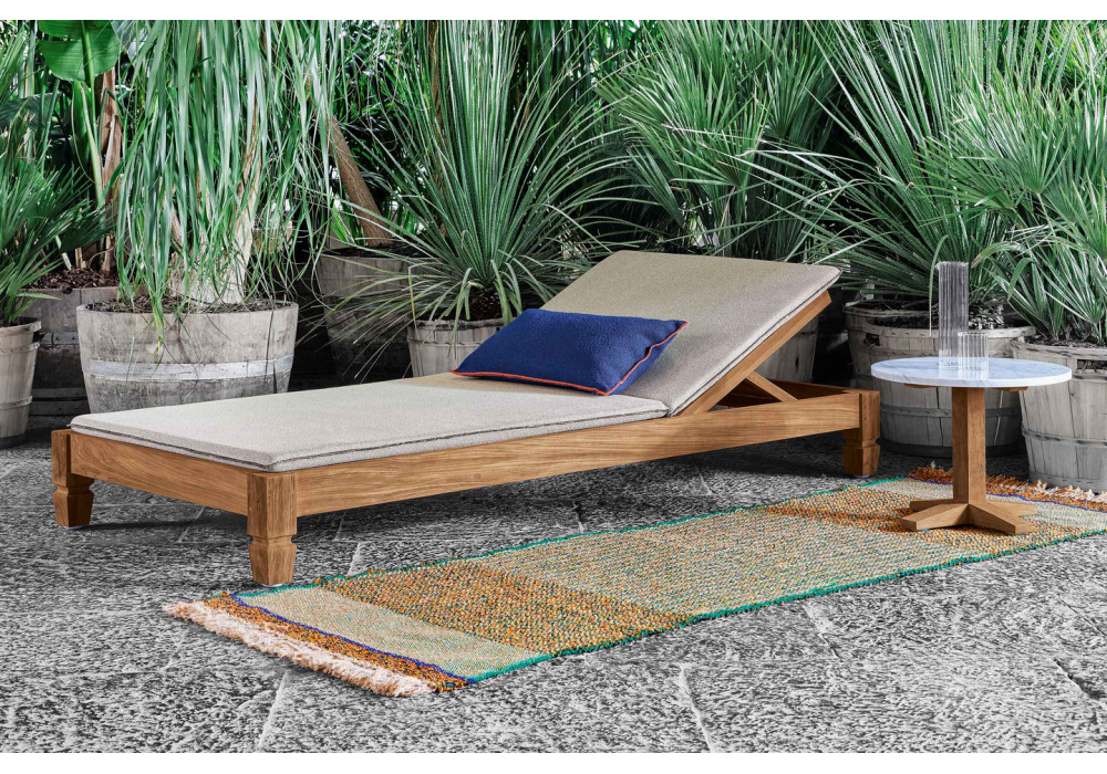 Jeko diseñada por Paola Navone para Gervasoni es una tumbona con respaldo reclinable realizada con estructura ECOTeak y colchón tapizado en tejido desenfundable.