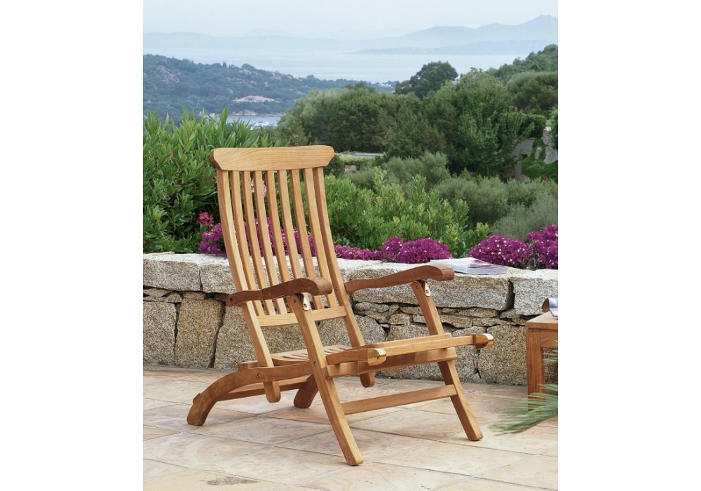 Chelsea producida y firmada por Unopiù es una chaise longue plegable con estructura de teca natural y juntas de metal. Los cojines están revestidos de material acrílico en diferentes acabados.