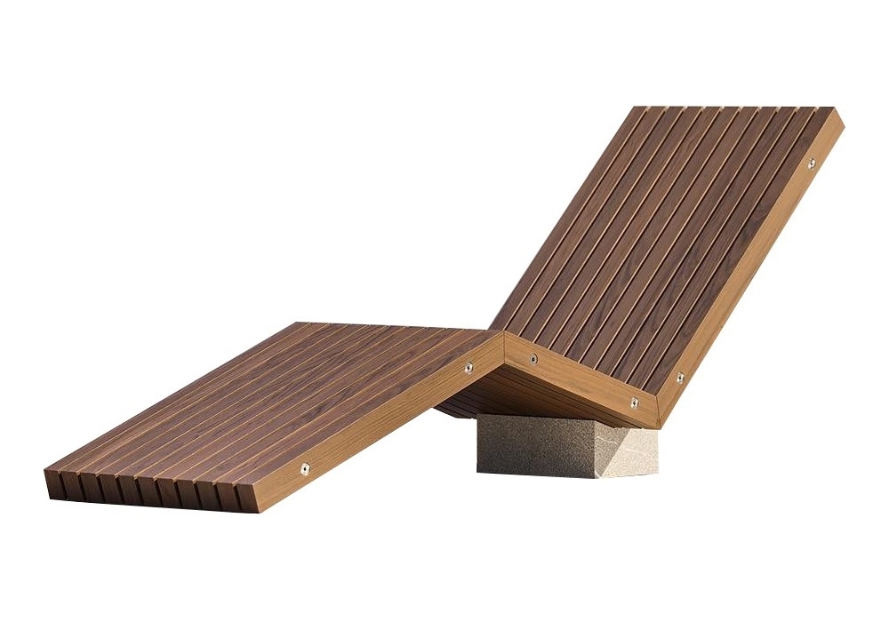 XY diseñada y producida por Modulnova es una tumbona con estructura de listones de madera maciza de fresno tratada térmicamente disponible en dos acabados (Light y Dark), unidos con barras roscadas y la correspondiente ferretería en acero inoxidable 316. La hace más sólida y resistente a la ambientes al aire libre. La base es de mármol.