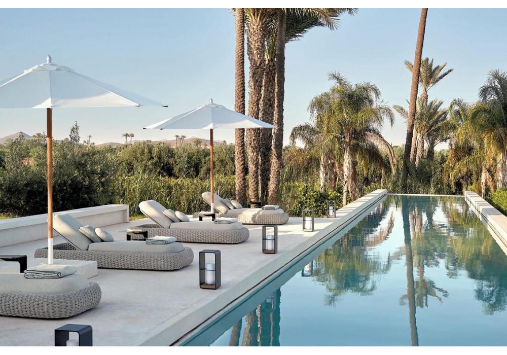 Kobo diseñada por Stephane De Winter para Manutti es una tumbona de exterior con estructura de cuerda tejida a mano alrededor de un marco de aluminio soldado. Disponible en diferentes acabados.