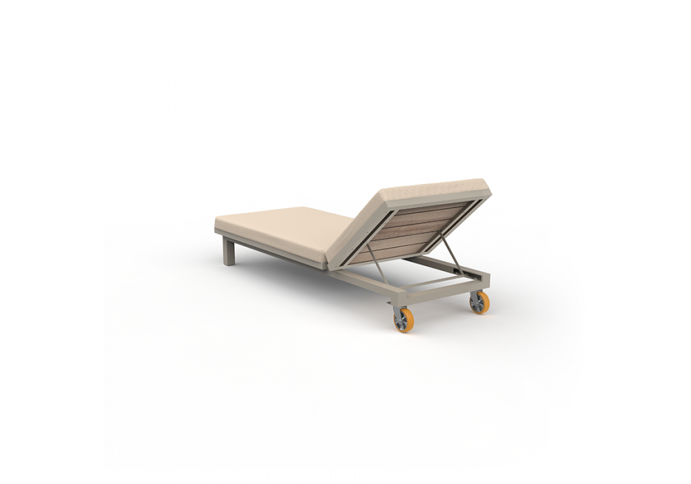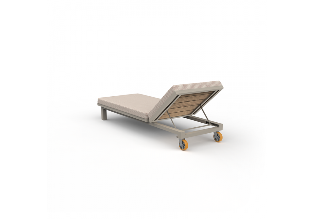 Vineyard diseñada por Ramón Esteve para Vondom es una tumbona realizada con estructura de aluminio, paneles de madera y cojín acolchado con revestimiento de tela.