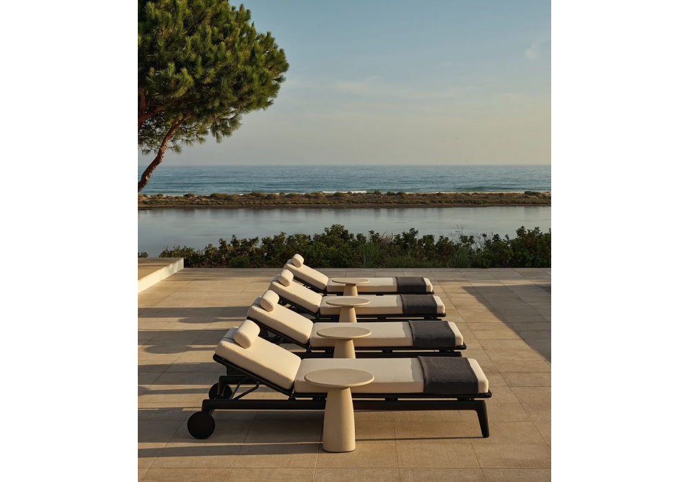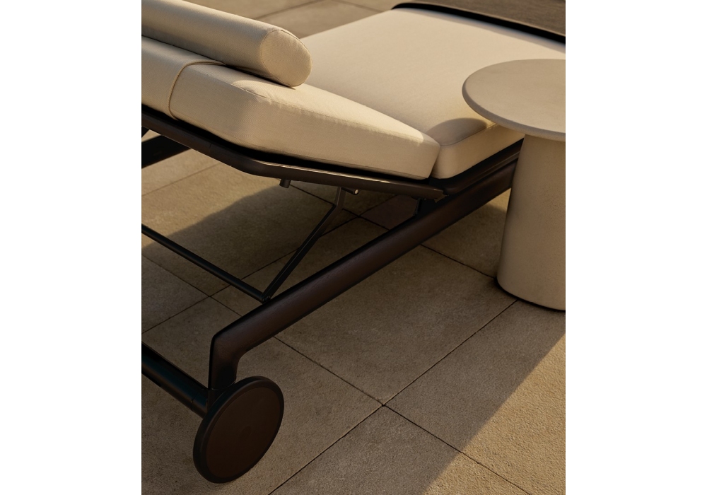 Magnolia diseñada por Emmanuel Gallina para Poliform es una tumbona con estructura de madera en acabado iroko natural o iroko teñido negro con partes de metal pintado marrón mate. Respaldo reclinable con cierre amortiguado. Ruedas de goma negra con llanta a juego con las piezas metálicas. Cojín de asiento y respaldo en poliéster PET reciclado con inserto de poliuretano. Reposacabezas en poliuretano. Prerevestimiento en fibra de poliéster con costuras termoselladas. Funda desenfundable en tejido.