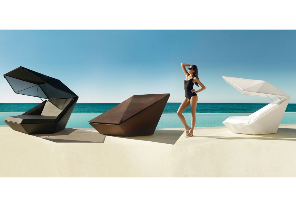 Faz diseñado por Ramón Esteve para Vondom es un daybed con parasol realizado en resina de polietileno rotomoldeado y revestimiento en tejido. 100% reciclable. Adecuado para uso en interiores y al aire libre. Disponible en diferentes acabados.