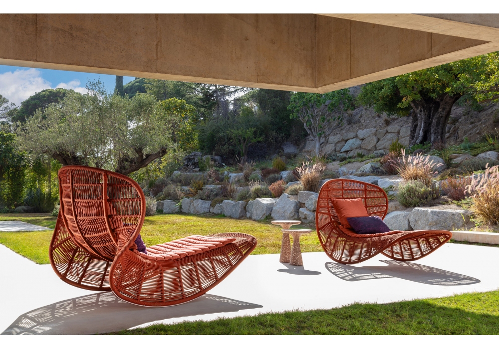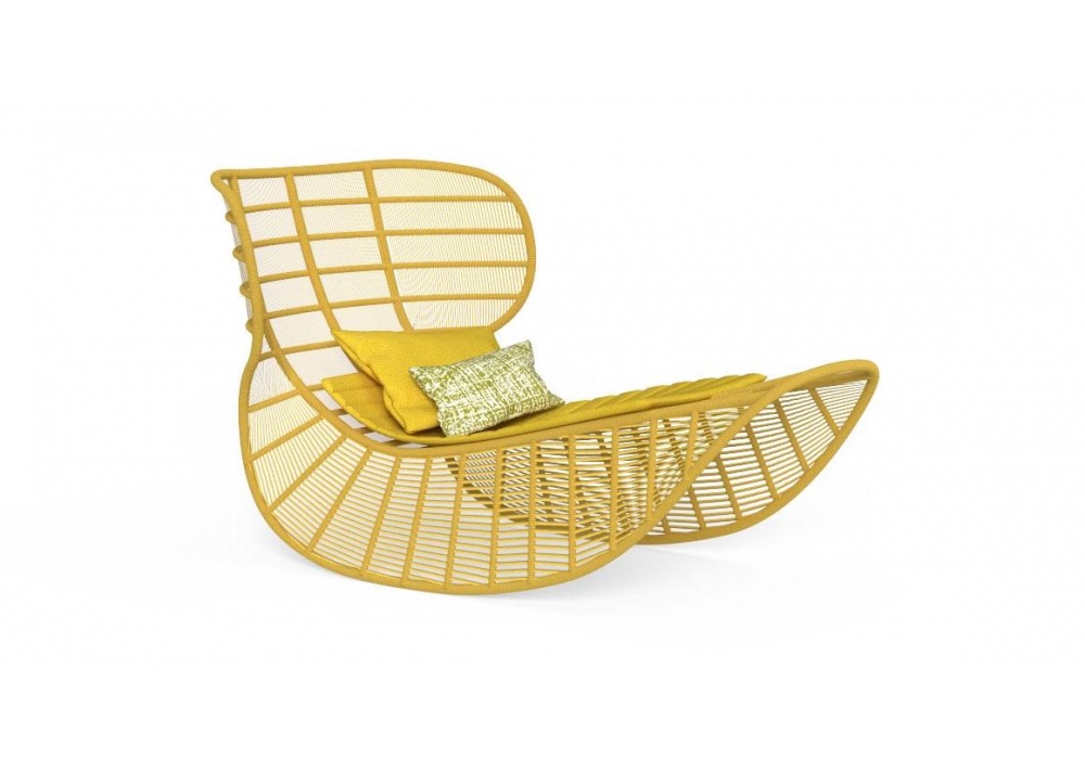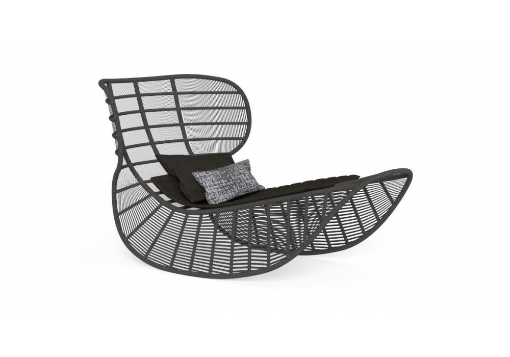 Panama diseñada por Ludovica & Roberto Palomba para Talenti es una tumbona mecedora realizada en aluminio revestida de cuerda sintética acolchada y revestimiento de cojín de tela. Disponible en diferentes acabados.