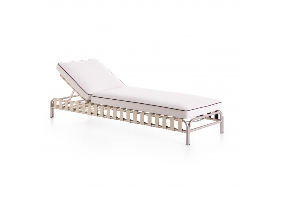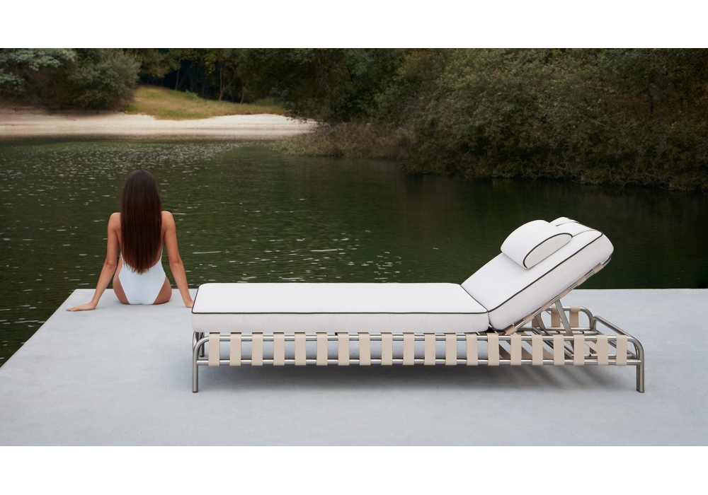 Onsen diseñada por Francesco Meda y David Quincoces para Gandia Blasco es una tumbona fabricada en acero inoxidable y aluminio con recubrimiento en polvo, con correas de cuero sintético, vinilo y poliéster. Asiento y respaldo de espuma de poliuretano reutilizable y fibra con tratamiento hidrófugo. Disponible en diferentes acabados.