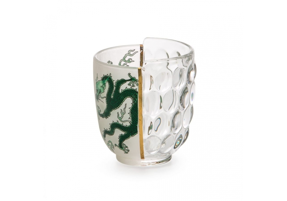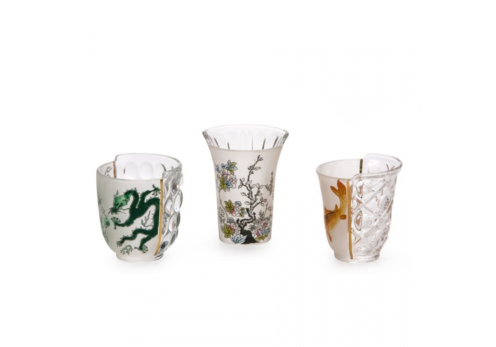 Hybrid Aglaura diseñado por CTRLZAK es un juego de copas de vidrio realizadas combinando dos formas opuestas. La superficie está mitad decorada y mitad transparente con una superficie texturizada.