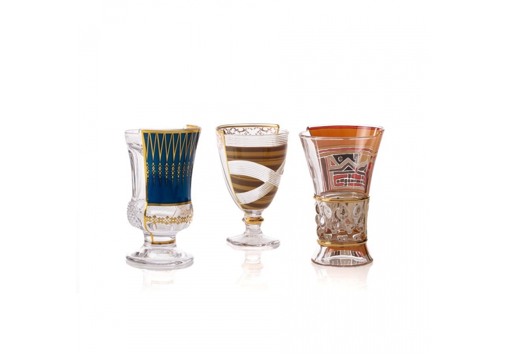 Hybrid Pannotia diseñado por CTRLZAK es un juego de vasos de vidrio elaborado combinando dos formas opuestas. La superficie está mitad decorada y mitad transparente.