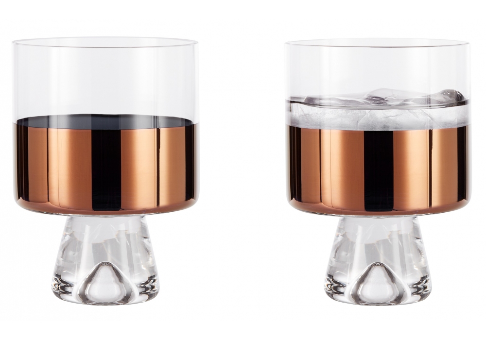 Tank Low Ball diseñado por Tom Dixon es un conjunto formado por dos vasos fabricados en vidrio soplado decorados con detalles disponibles en acabados cobre o negro.