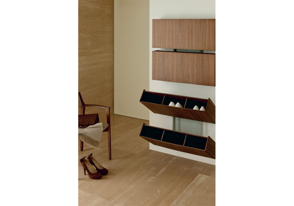 Pit Stop diseñado por T. Colzani para Porada es un zapatero de pared en nogal canaletta. Los frentes están disponibles en espejo natural o ahumado, nogal o revestidos de cuoietto.