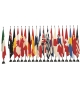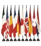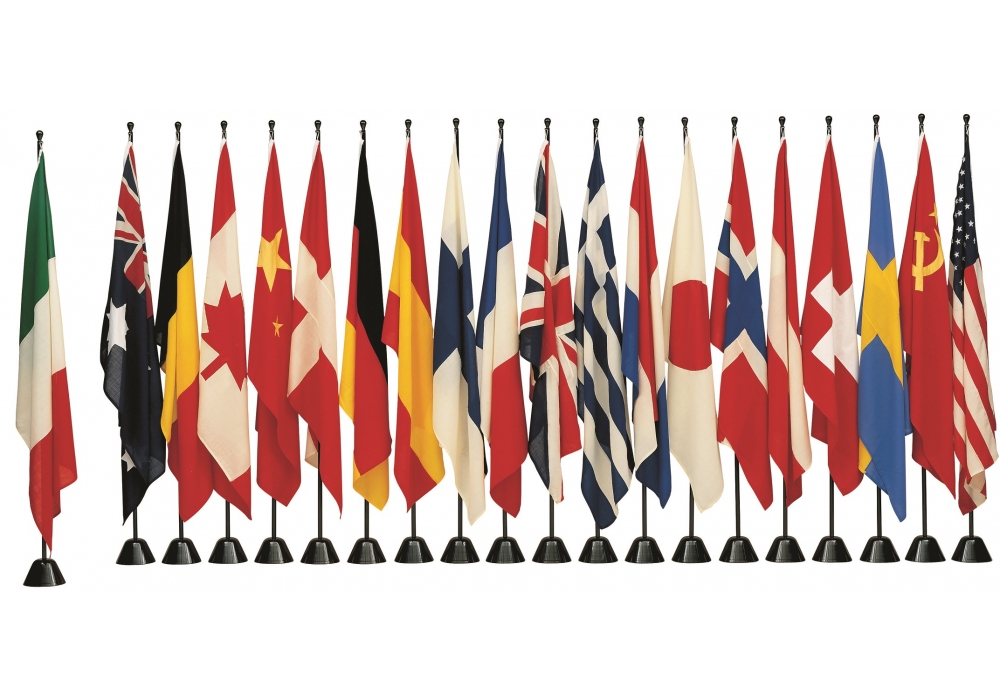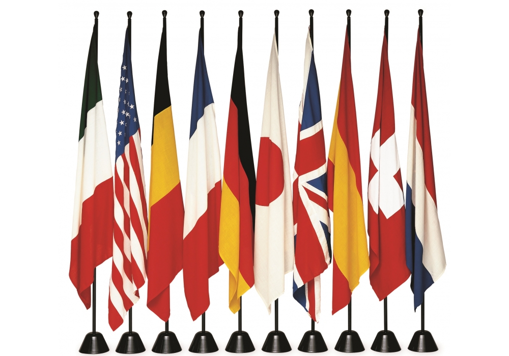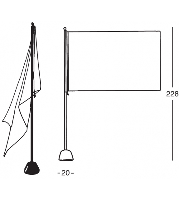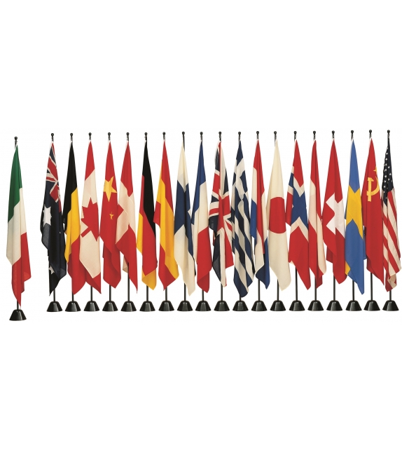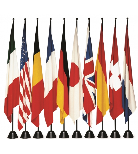 515 Servob Bandiera conçu par Achille & Pier Giacomo Castiglioni pour Zanotta est un porte-étendard. Base en polypropylène noir. Tige de support en acier peint, couleur noire pour l'extérieur. Drapeau en laine polyester. Couleurs, symboles et tailles à partir des spécifications. Dimensions du tissu 100 x 150 cm. Le drapeau suisse mesure 100 x 100 cm. Les symboles des drapeaux des États-Unis et du Conseil de l'Europe sont brodés.
