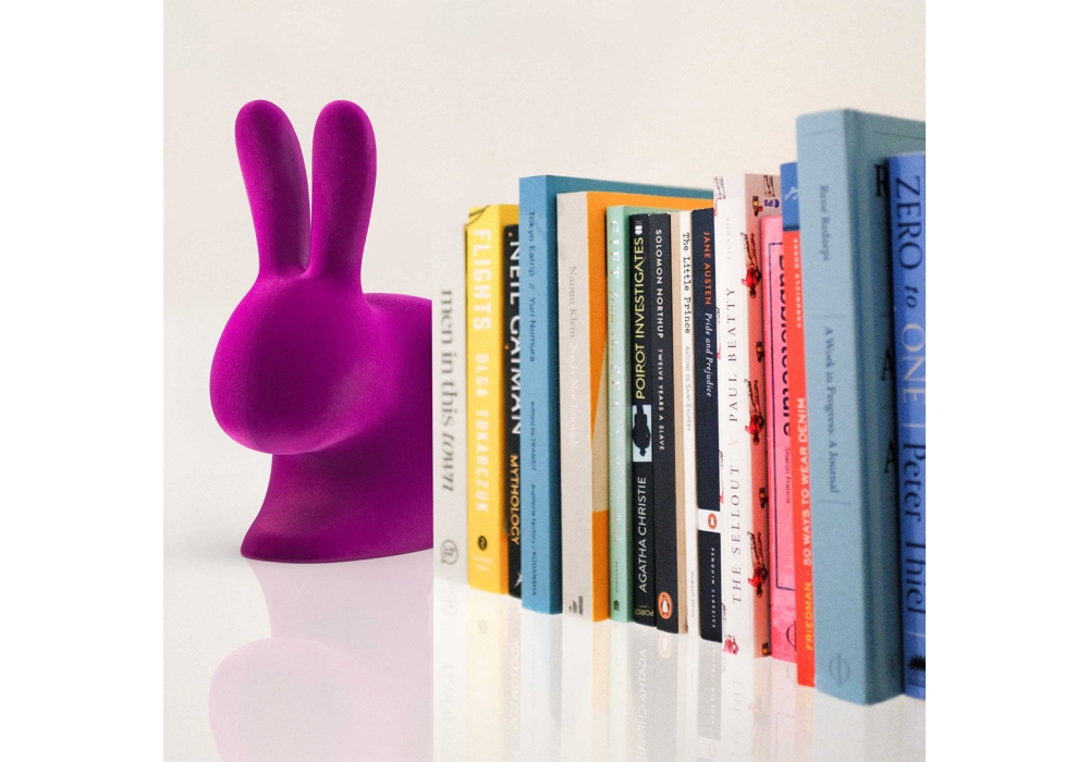 Rabbit XS conçu par Stefano Giovannoni pour Qeeboo est un serre-livres en polyéthylène recouvert de velours.