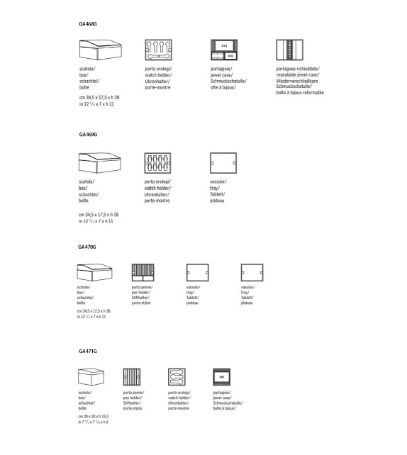 Passion Box conçu et produit par Giorgetti est un compartiment de rangement en cuir de veau avec doublure en daim. Il peut contenir deux ou trois tiroirs amovibles et une pochette amovible. Les plateaux sont caractérisés par différentes fonctions : porte-stylo ; apporte des montres ou des bijoux. Disponible en différentes finitions.