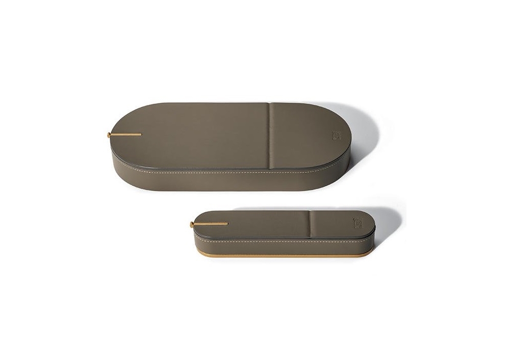 Zhuang conçu par Neri & Hu pour Poltrona Frau est un kit de bureau composé d'un boîte de rangement, un porte-plume avec règle et d'un plateau de travail. Tous les détails métalliques sont en acier brossé avec finition en laiton naturel. Revêtement en cuir Saddle Extra couleur tortora.