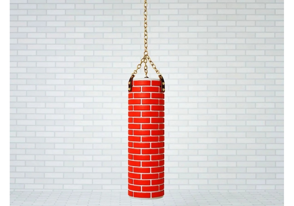 Punch a Wall conçu par Studio Job pour Gufram est un sac de boxe en polyuréthane avec un motif de briques entièrement recouvert de Guflac®.