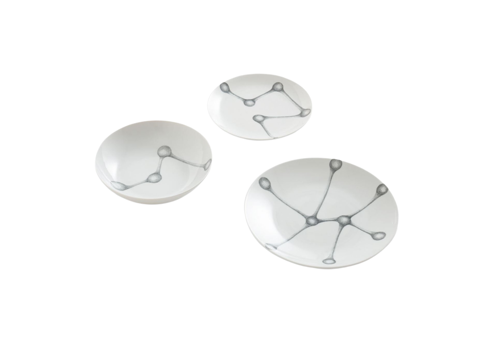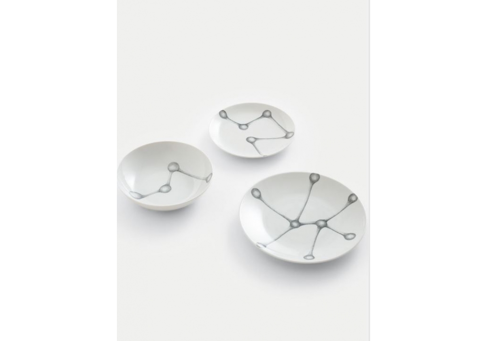 Floema conçu par Roberto Cambi pour Giorgetti est un ensemble de 18 assiettes, en porcelaine blanche, composé de : N. 6 assiettes creuses ; N. 6 assiettes plates ; N. 6 assiettes à fruits ou à dessert. Lorsqu'il est utilisé comme décoration murale, le concept inspirant permet d'identifier des variations infinies, par nombre de pièces et de motifs. Les assiettes passent au lave-vaisselle et au micro-ondes.