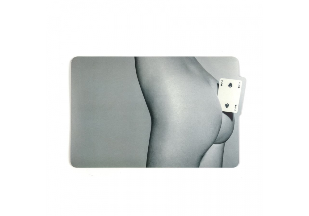 Two of Spades conçu par Toiletpaper pour Seletti est un set de table quadrangulaire en liège recouvert de polypropylène avec une figure en niveaux de gris.