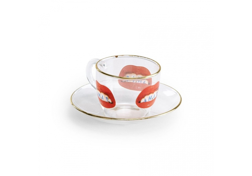 Shit conçue par Toiletpaper pour Seletti est une tasse à café avec soucoupe en verre borosilicate transparent. Le bord de la soucoupe et de la tasse est de couleur dorée tandis que les impressions sur les côtés sont colorées avec divers pigments.