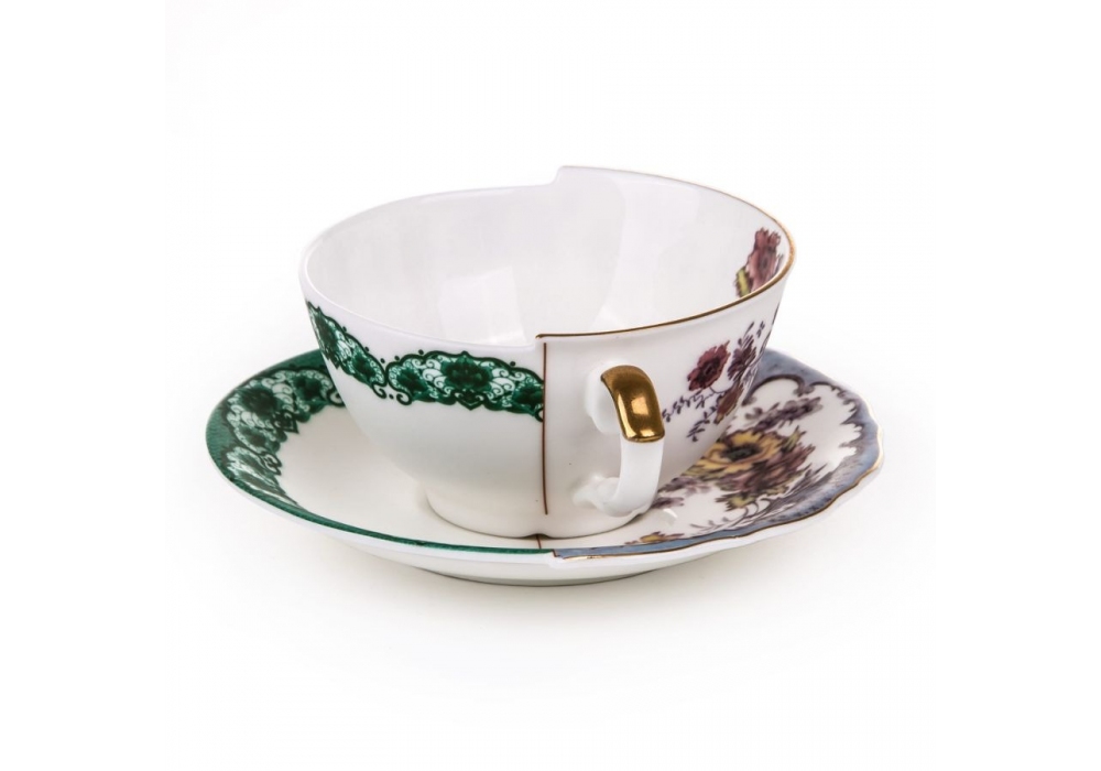 Hybrid Isidora conçue par CTRLZAK pour Seletti est une tasse à thé et une soucoupe en porcelaine blanche avec anse dorée. L'ensemble est réalisé à partir de la combinaison de deux formes différentes avec des imprimés colorés sur les côtés et sur le dessus de la chaussure.