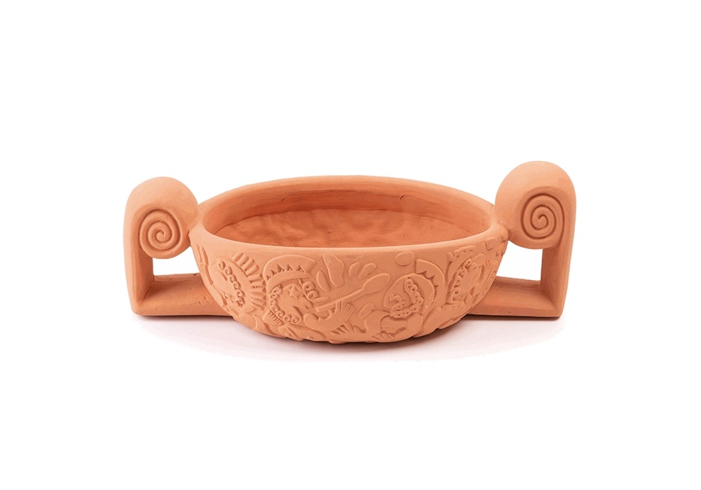 Magna Graecia conçue par Antonio Aricò pour Seletti est une pièce maîtresse circulaire entièrement réalisée en terre cuite avec diverses représentations gravées et des poignées pratiques. Magna Graecia est disponible en différentes finitions.