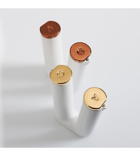 Twins conçue par Gordon Guillaumier pour Bosa est une burette en céramique émaillée fabriquée à la main qui permet de contenir huile et vinaigre dans le même objet. Les initiales gravées sur les capuchons créent le sentiment d'un objet ancien. Twins réinvente un objet commun avec une élégante finition en or ou cuivre brillant et donne sophistication à tout table.