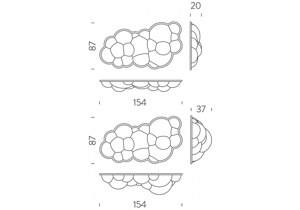 Nuvola conçue par Mario Bellini pour Nemo est une applique/plafonnier en polyéthylène naturel opale ou PETG blanc. La source lumineuse utilisée est de type LED dimmable. Nuvola est disponible en deux tailles différentes.