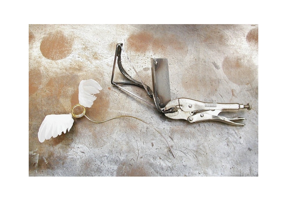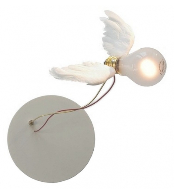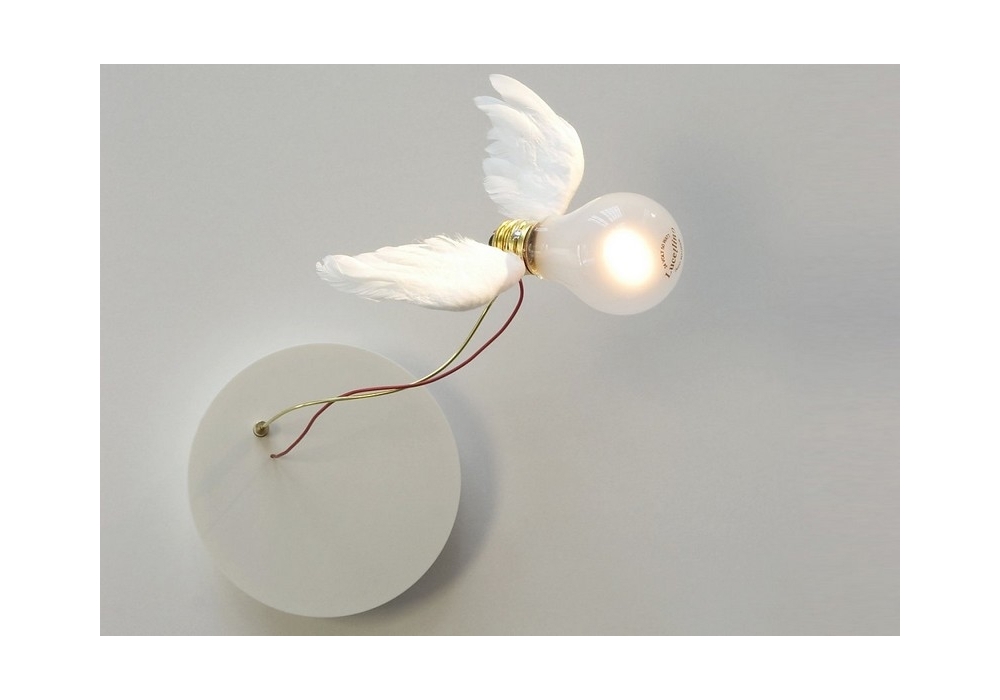 Lucellino NT conçue et produite par Ingo Maurer est une applique murale à LED, avec structure en verre, laiton, matière synthétique avec application d'ailes en plumes d'oie.