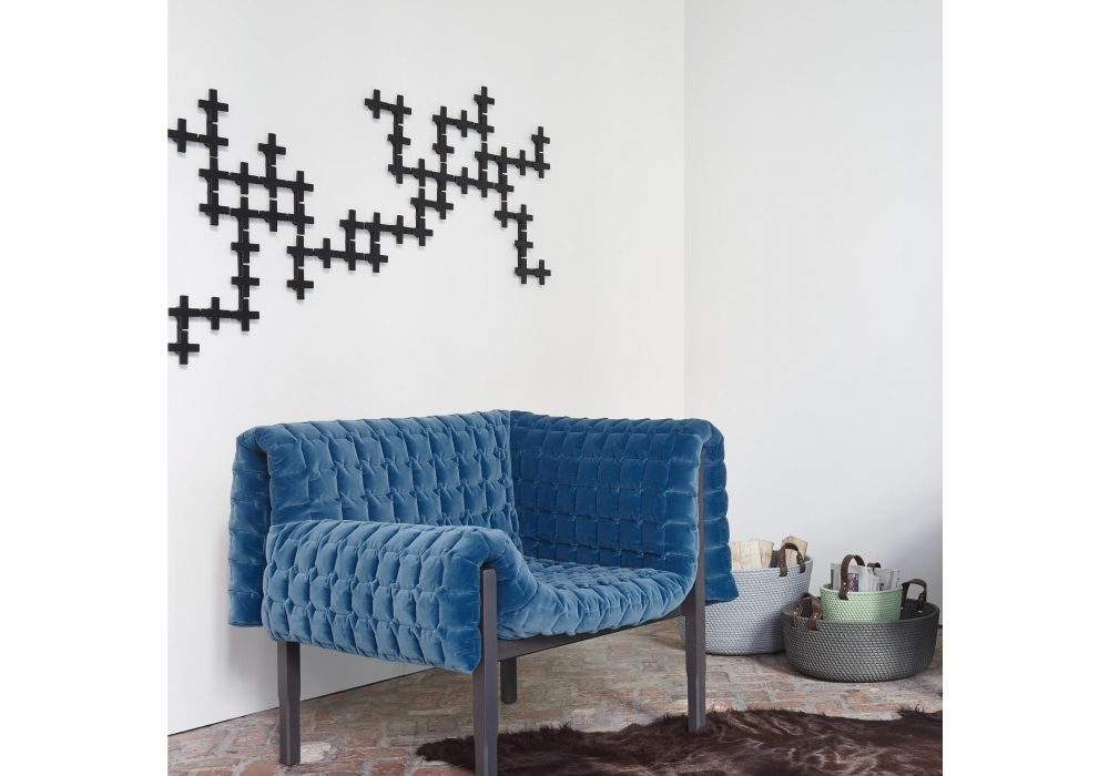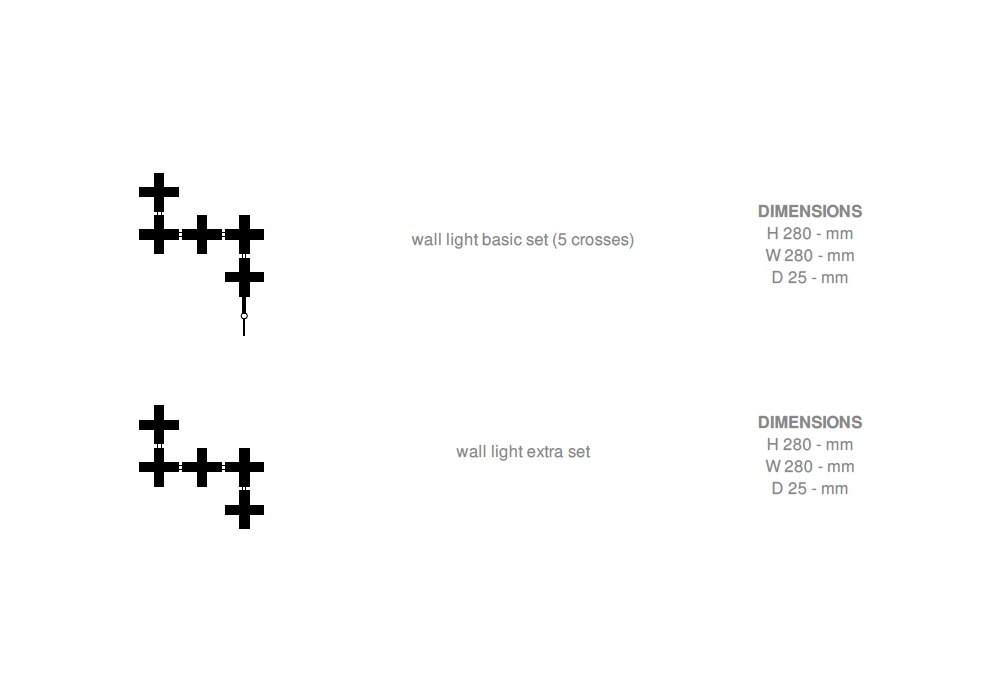 041 est une applique conçu par Gabriela Chicherio pour Ligne Roset. Construction et fonctionnement très ludiques, rappelant le célèbre jeu de morpion. Ils permettent la réalisation personnalisée d'ensembles décoratifs dont on peut doser l'intensité lumineuse, en choisissant le nombre de croix allumées. Applique constituée de sets de 5 croix en polycarbonate injecté noir mat, rétro-éclairées par leds, clipsées et connectées sur un chemin mural (en forme de double L) en acier laqué noir mat. Chaque set peut s'utiliser seul ou se combiner à d'autres (jusqu'à 6 au total). Dimensions d'un croix : H 9 x L 9 x P 2,5. Chaque set complémentaire peut se connecter sur n'importe quelle croix du ou des sets déjà installés. Il est ainsi possible de créer d'innombrables installations. Chaque croix tourne à 45°, ce qui coupe le courant (rotation à gauche) ou le laisse passer (rotation à droite), créant ainsi une multitude de chemins lumineux. Chaque set de 5 croix est équipé de leds totalisant 10W, dégageant une puissance lumineuse de 780 Lumen (équivalent ampoule incandescente 65 W). Température de couleur 3000 K (blanc chaud). Câble noir de 2,5 m. La première croix sert d'interrupteur général.