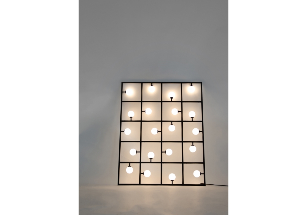 Squares conçu par Atelier Aret est une lampe de mur ou de sol en métal, avec sphères de verre. Elle est composé de 20 boules de verre soufflé avec chacune une ampoule 2W LED blanc chaud. La structure est disponible en blanc ou noir. Ampoules incluses. Squares n’est pas seulement une lampe, mais surtout une sculpture lumineuse. Elle a été conçue pour s’appuyer simplement contre un mur ou peut être montée au mur, créant ainsi un mur lumineux.