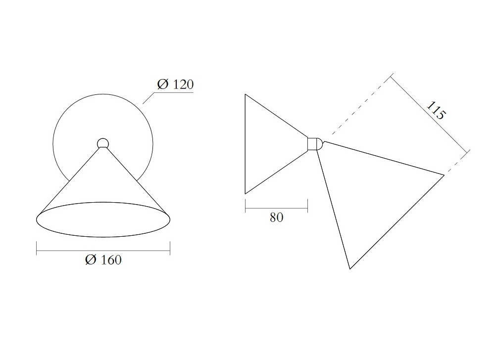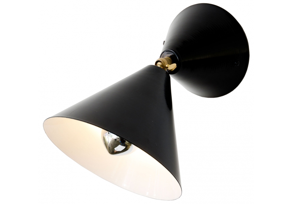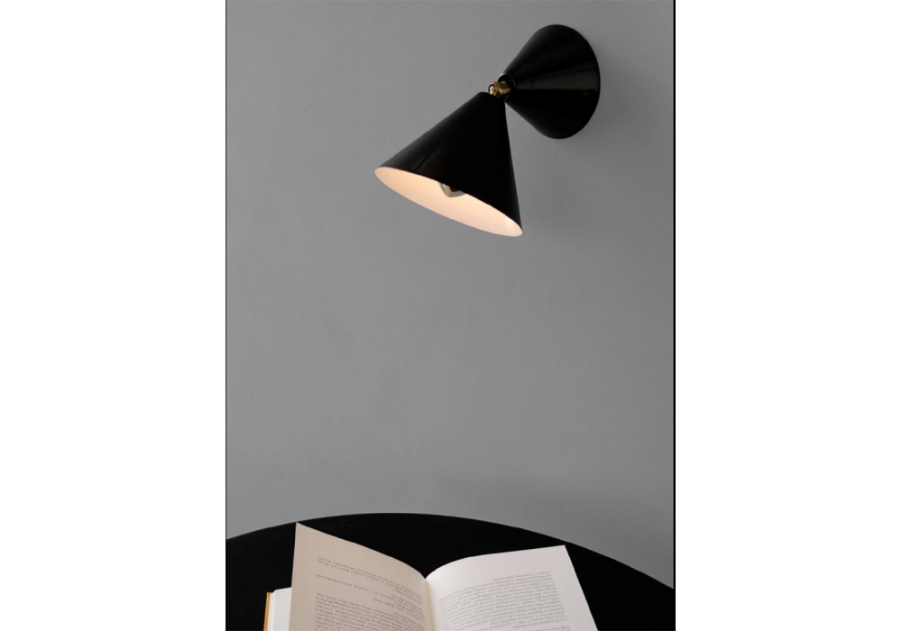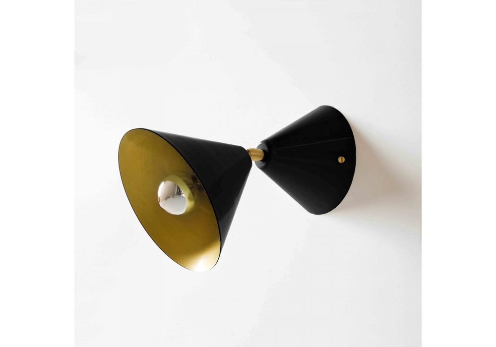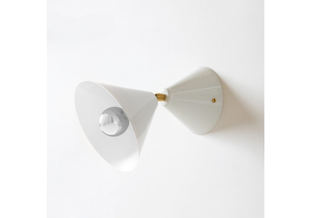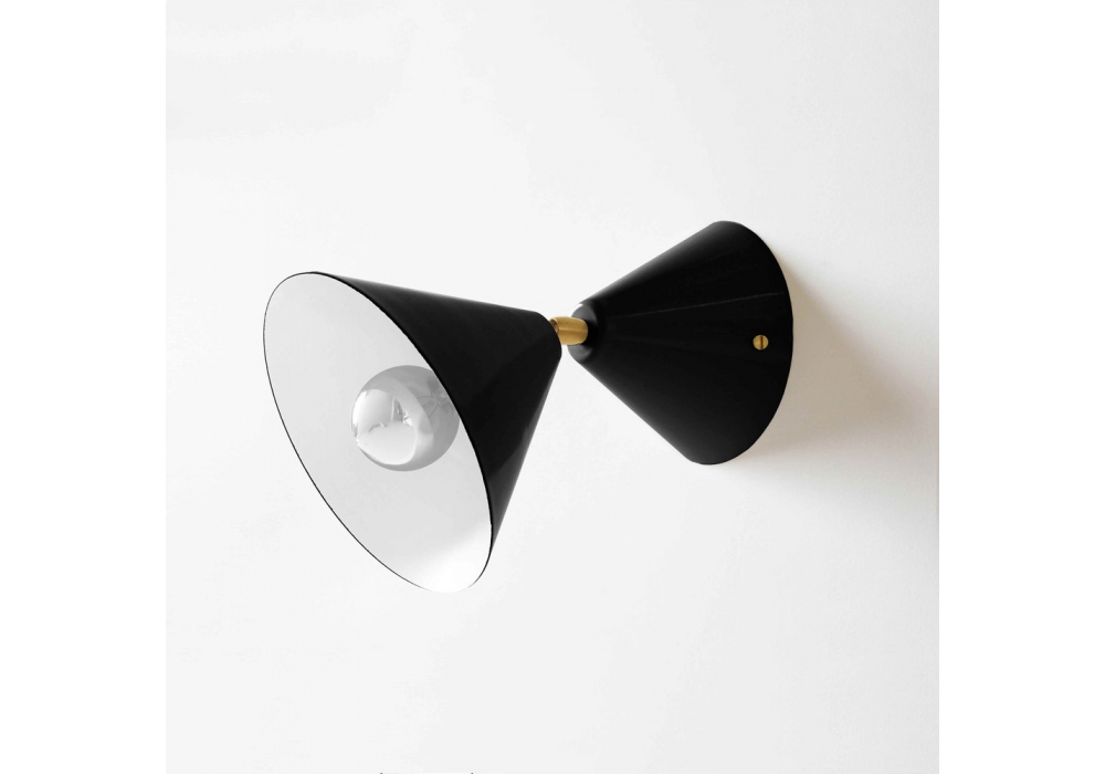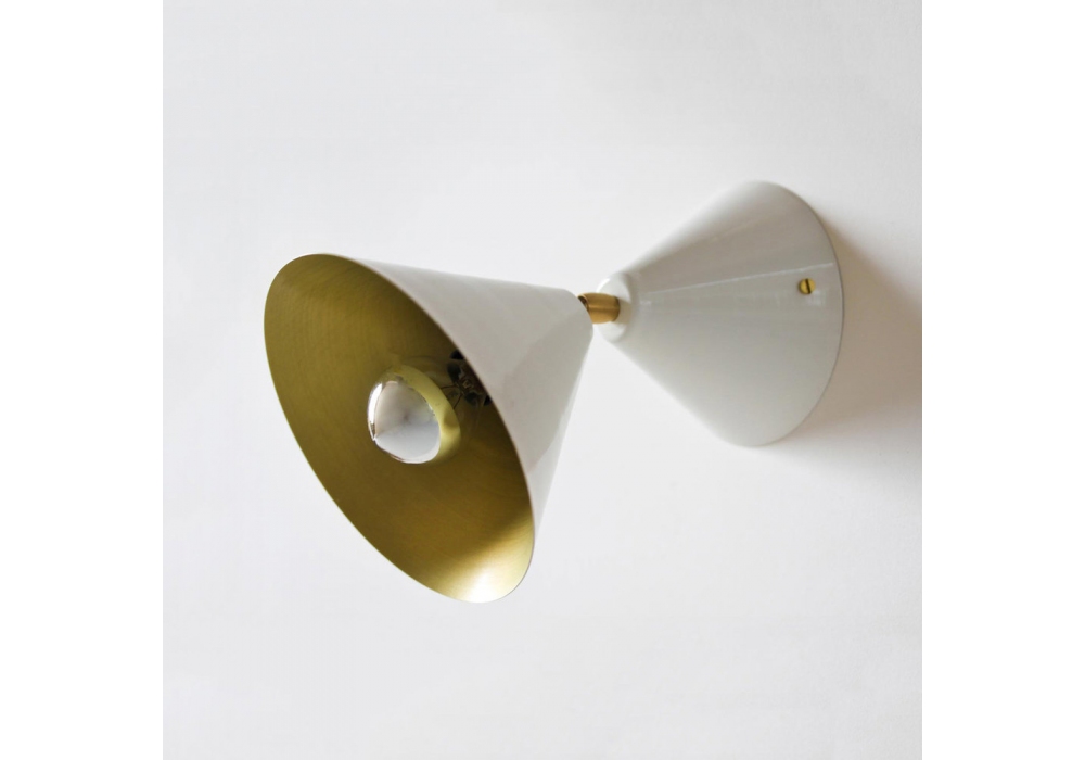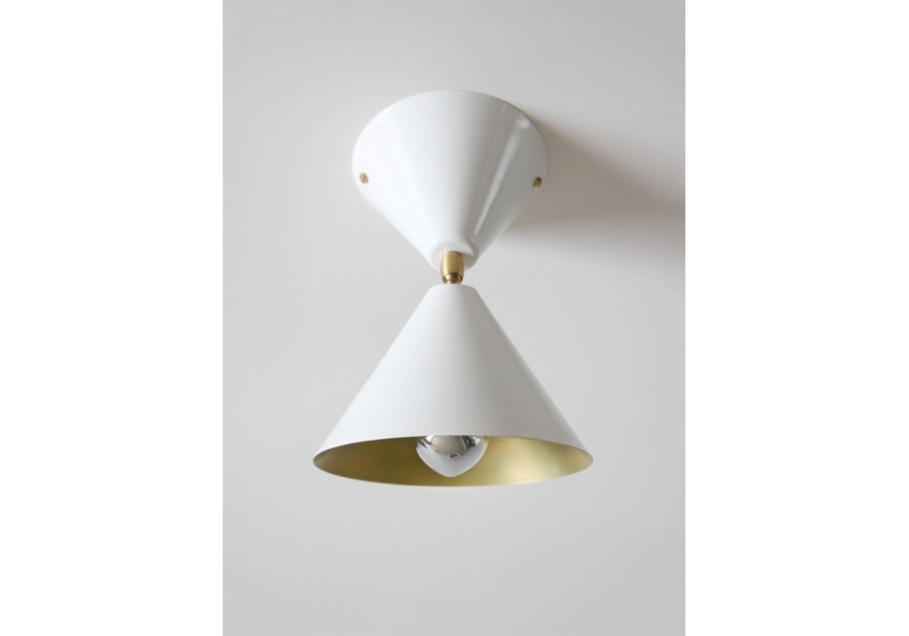The Cone, a wall and ceiling lamp produced by Atelier Areti, is made of two cones connected with a joint, wich allows for the larger cone to be turned in any direction. Material and fabrication: Hand spun, powder coated metal and brass joint. Available in black and white. Light bulbs not included.
