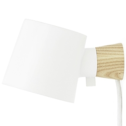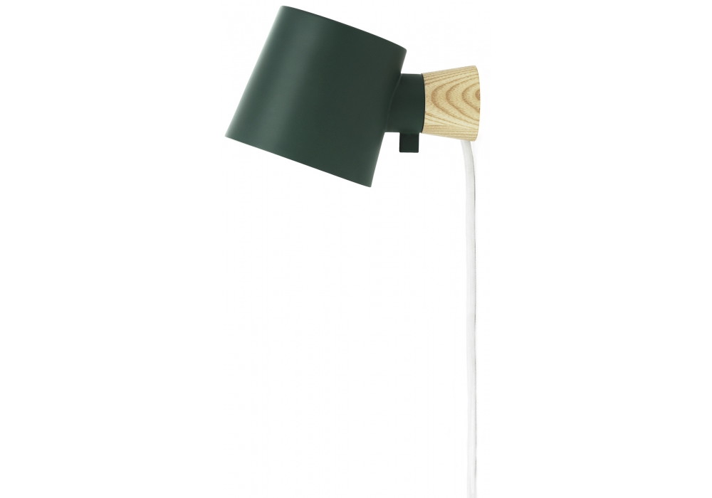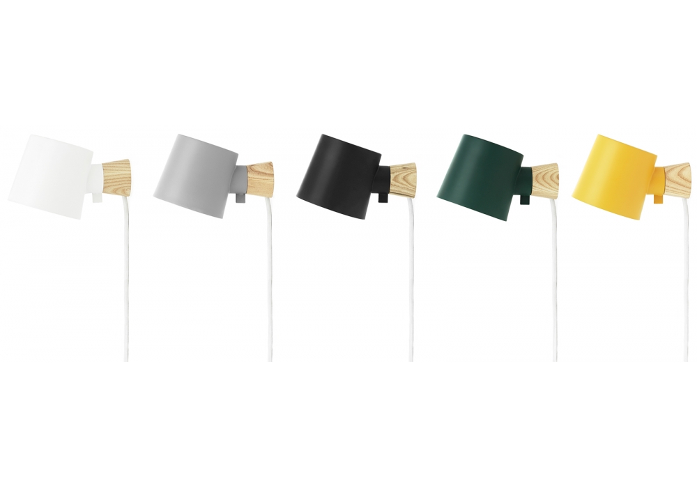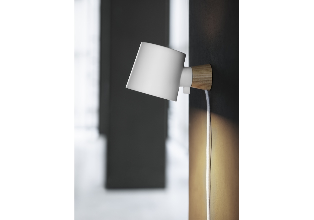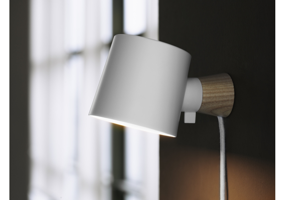 Rise conçue par Marianne Andersen pour Normann Copenhagen est une applique murale avec base en chêne et diffuseur en acier enduit de poudre. La base et le diffuseur cylindrique de Rise sont reliés par une goupille qui permet de faire pivoter l'écran autour de la base et d'ajuster la direction de la lumière et permet également un éclairage direct et indirect. Rise est disponible en version EU (Europe) ou US (U.S.A), et modèle avec prise murale ou prise directe au système électrique.
