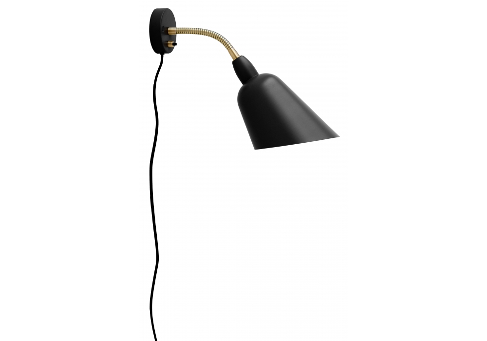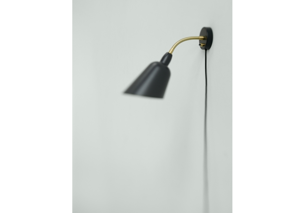 Bellevue conçue par Arne Jacobsen pour &Tradition est une applique en laiton poli et laqué satiné avec aluminium laqué, rosace en fonte, câble textile noir avec interrupteur marche-arrêt.