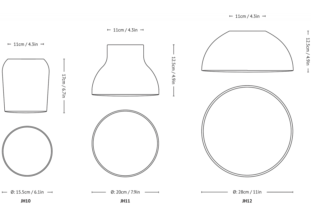 | Dimensions | Ø 15,5 x H 17 cm (JH10); Ø 20 x H 12.5 cm (JH11); Ø 28 x H 12.5 cm (JH12). |