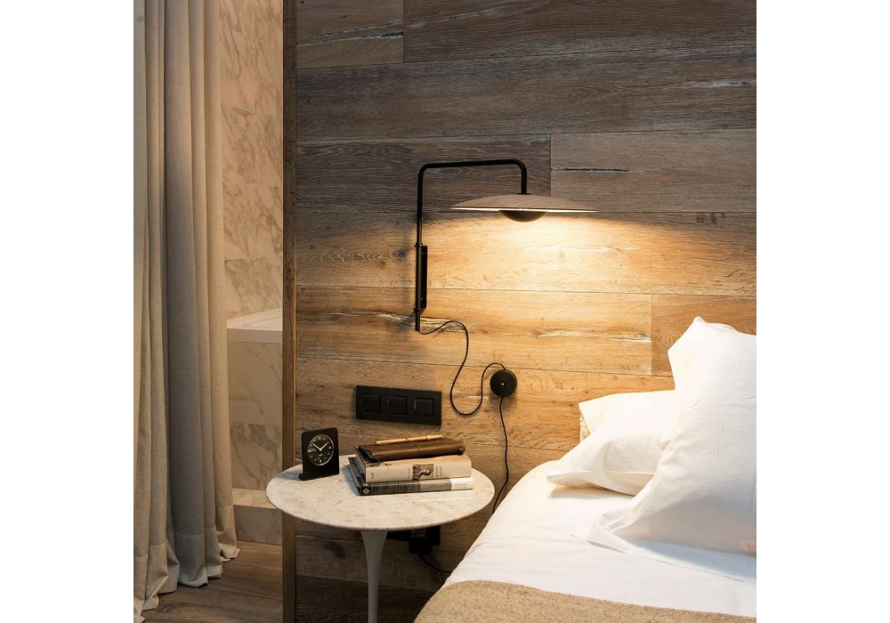 Ginger A conçue par Joan Gaspar pour Marset est une applique avec diffuseur en bois pressé de 4 mm en chêne naturel ou wengé. Diffuseur en aluminium laqué noir mat. Également disponible en 2 modèles.