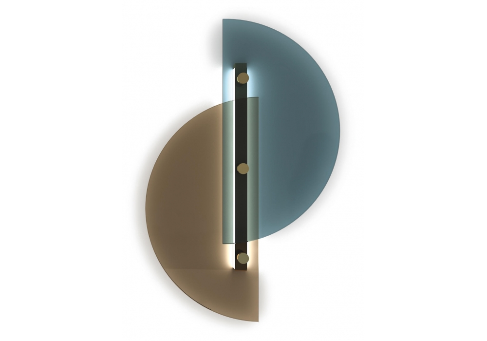 Papillon conçue par Bernhardt & Vella pour Arflex est une applique LED composée de deux verres trempés et feuilletés. Structure en métal doré. Disponible en deux combinaisons de couleurs prédéfinies: rose et gris ou bleu clair et bronze.